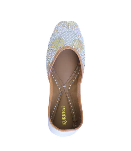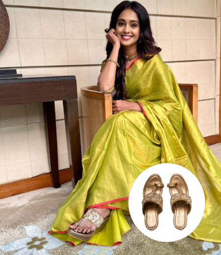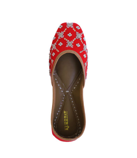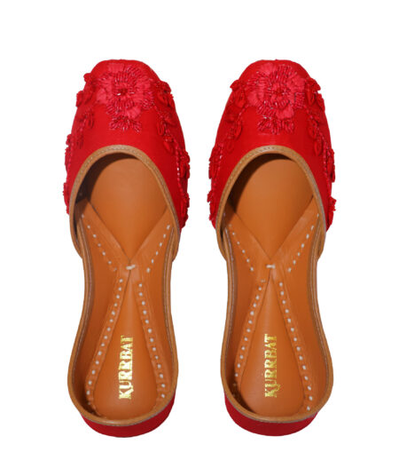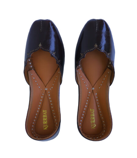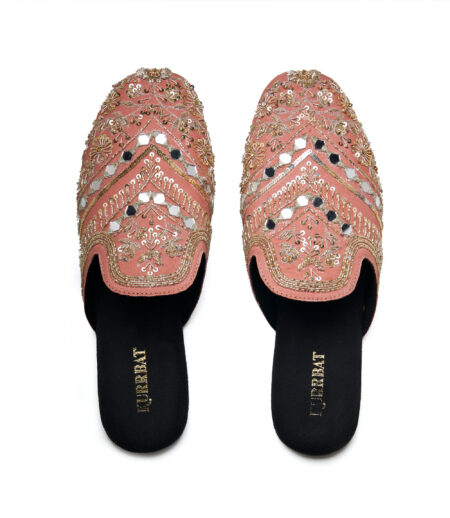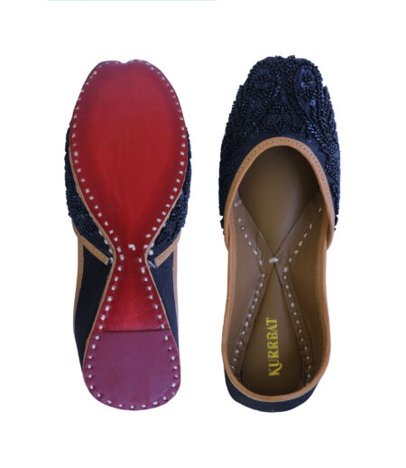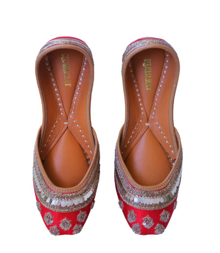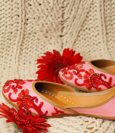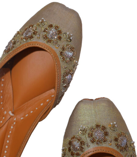 This jutti brings together timeless craftsmanship and festive charm. Hand-embroidered with zardozi and mirror work, it carries intricate details that glimmer with every step. The warm coloured base paired with golden highlights makes it a perfect match for weddings, festive evenings, or even elevating your everyday ethnic looks. Material: Leather […]