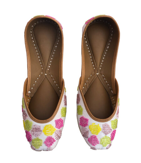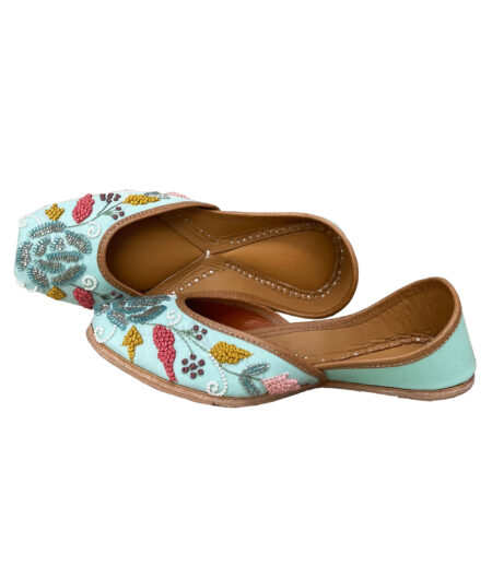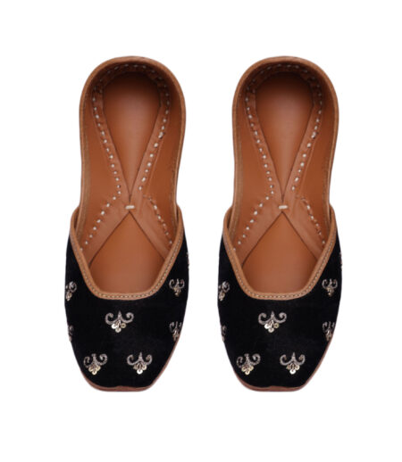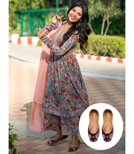 This jutti brings together timeless craftsmanship and festive charm. Hand-embroidered with zardozi and mirror work, it carries intricate details that glimmer with every step. The warm coloured base paired with golden highlights makes it a perfect match for weddings, festive evenings, or even elevating your everyday ethnic looks. Material: Leather […]