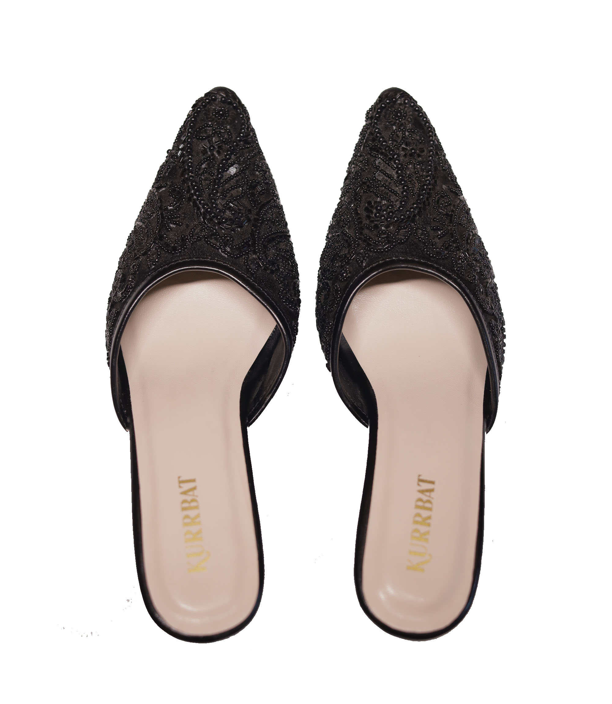 Experience the perfect blend of grace and style with Juliet coal heels. Featuring intricate black embroidery,  adorned with delicate black pearls and cutdana, this classic backless heel exudes timeless elegance. Its refined design and subtle charm make it a must-have for every wardrobe. Simply beautiful, forever stylish.