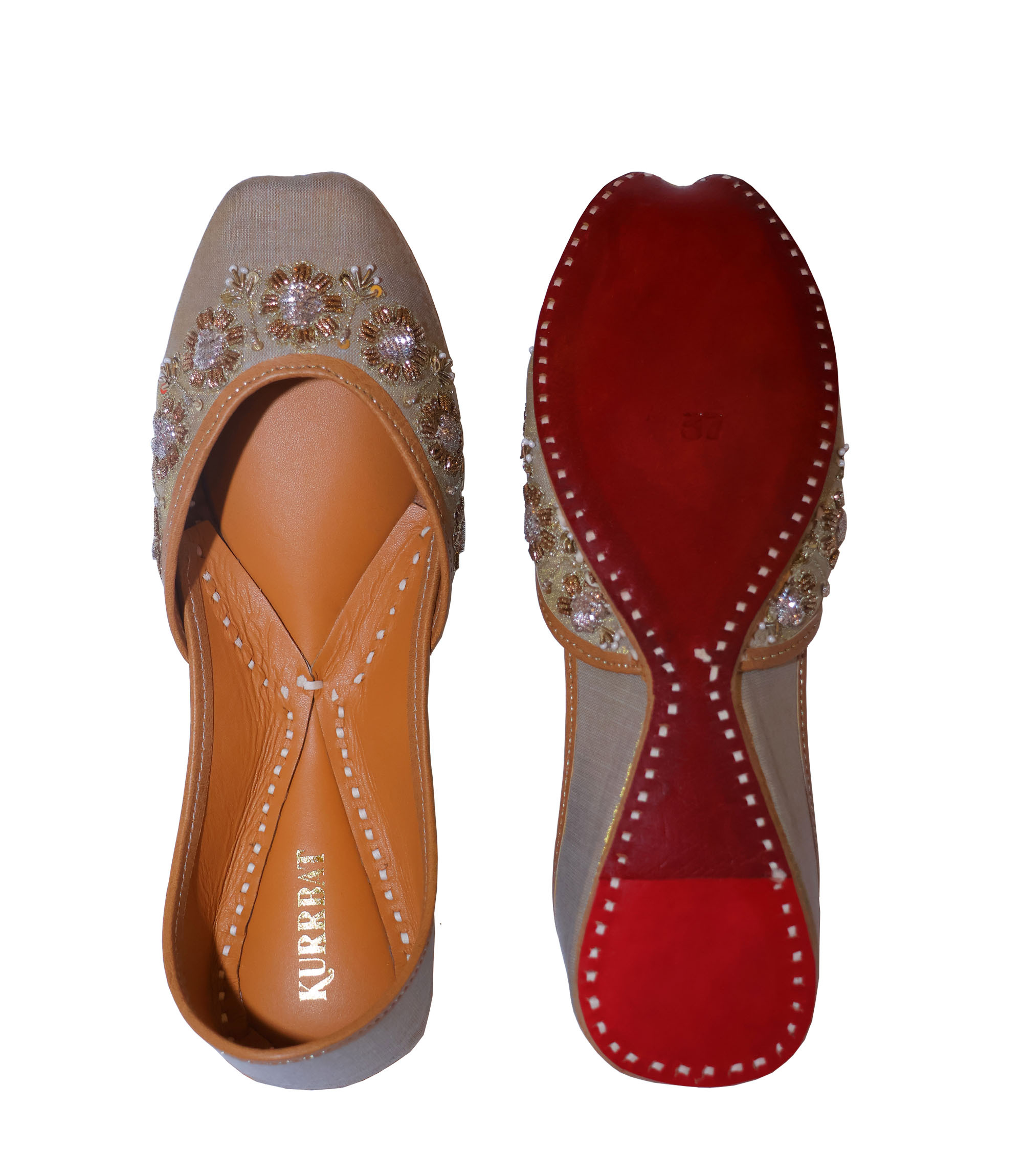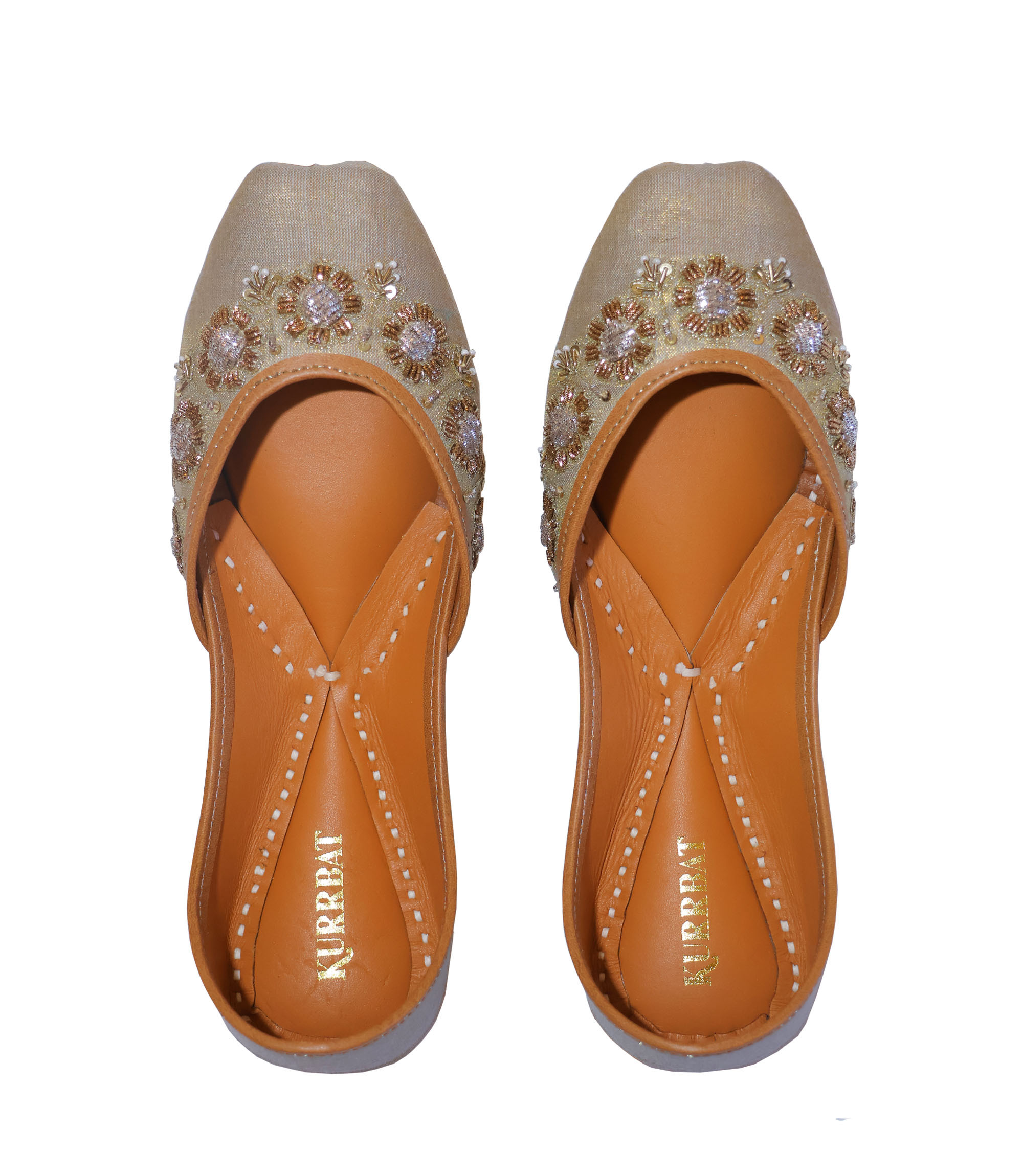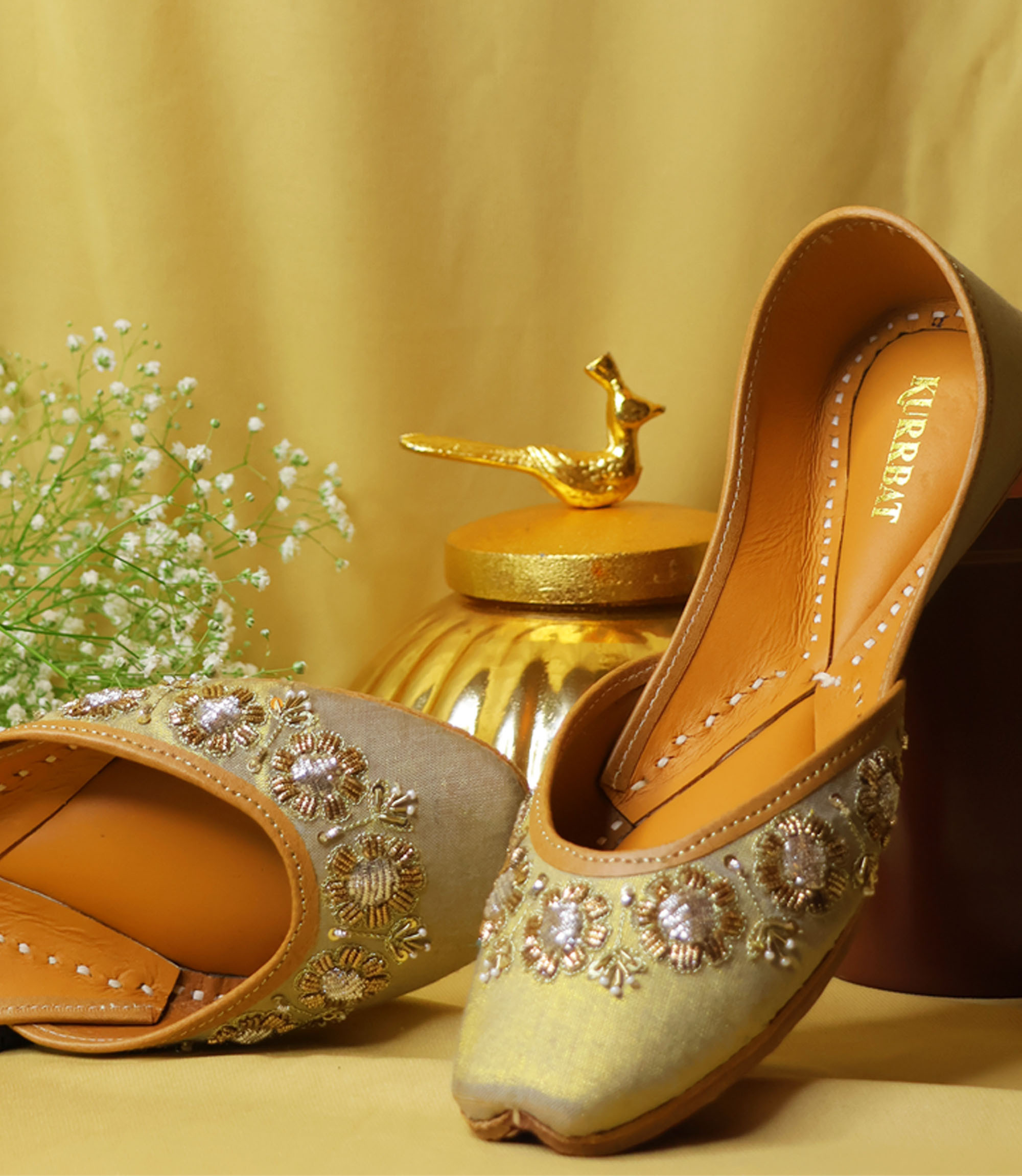 A classic champagne-gold jutti, handcrafted with intricate zardosi work and delicate